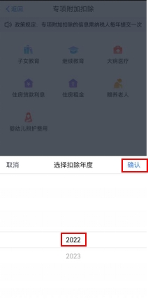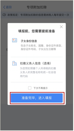 第二步,选择扣除年度。进入申报界面后,“选择扣除年度”设为2022年,点击“确认”后,系统会提示需要提前准备的资料,纳税人仔细阅读后,点击“准备完毕,进入填报”。