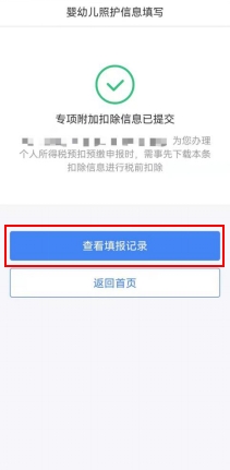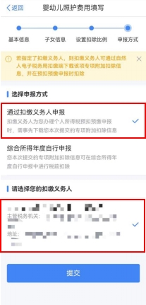 第五步,选择申报方式。设置扣除比例后,进入“申报方式”界面,纳税人可根据实际情况选择“通过扣缴义务人申报”或“综合所得年度自行申报”任意一种方式。如果纳税人需要在每月发放工资薪金时享受专项附加扣除,需要选择“通过扣缴义务人申报”,并核实扣缴义务人信息是否准确。选择完成后,点击“提交”,即完成3岁以下婴幼儿照护专项附加扣除填报流程,系统将弹出“专项附加扣除信息已提交”的提示。纳税人可以点击“查看填报记录”查看已经申报的专项附加扣除信息。