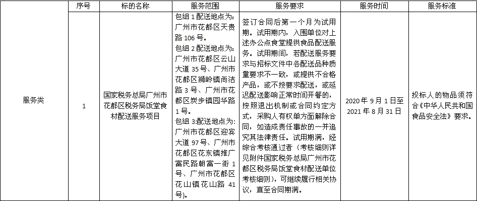 二、项目名称:国家税务总局广州市花都区税务局饭堂食材配送服务项目