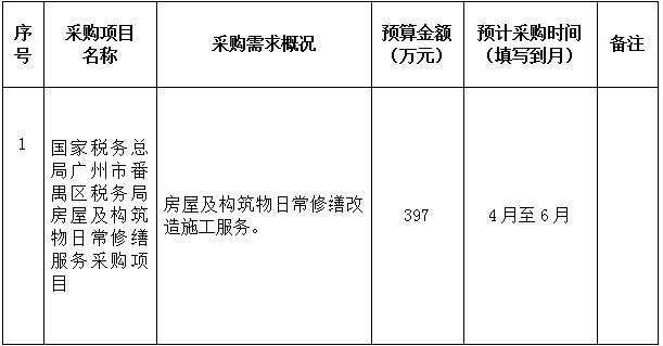 为便于供应商及时了解政府采购信息,根据《财政部关于开展政府采购意向公开工作的通知》(财库〔2020〕10号)等有关规定,现将国家税务总局广州市番禺区税务局2023年4月至6月采购意向公开如下: