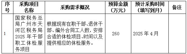 为便于供应商及时了解政府采购信息,根据《财政部关于开展政府采购意向公开工作的通知》(财库〔2020〕10号)等有关规定,现将国家税务总局广州市天河区税务局2025年4至6月采购意向公开如下: