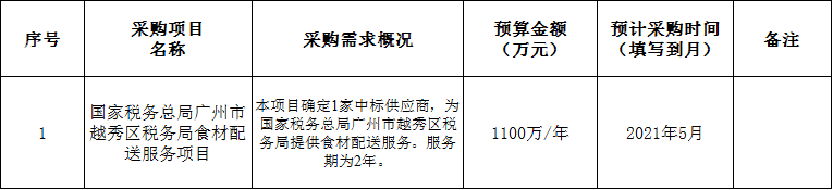 为便于供应商及时了解政府采购信息,根据《财政部关于开展政府采购意向公开工作的通知》(财库〔2020〕10号)等有关规定,现将国家税务总局广州市越秀区税务局2021年4至6月采购意向公开如下: