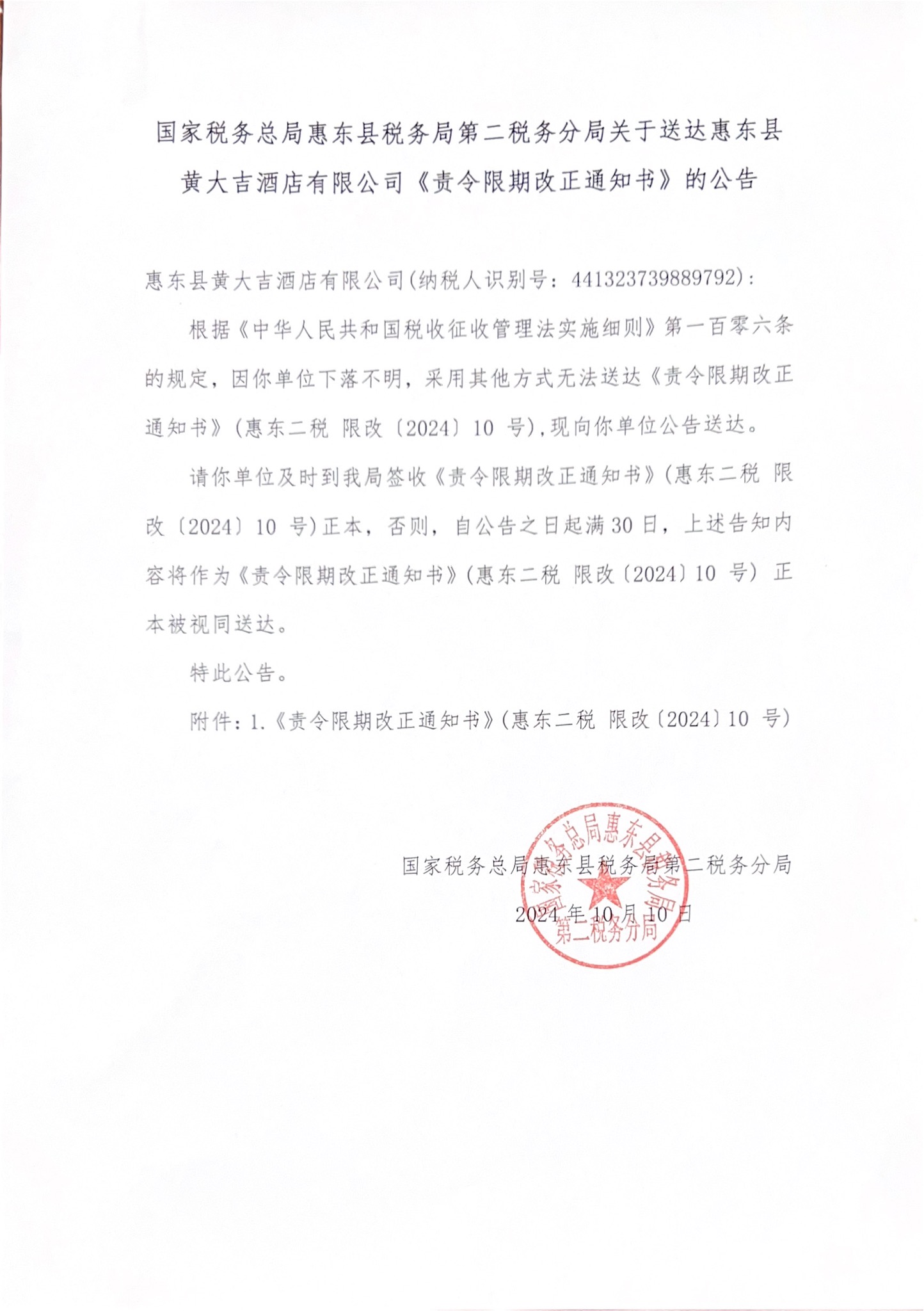 国家税务总局惠东县税务局第二税务分局关于送达惠东县黄大吉酒店有限公司《责令限期改正通知书》的公告