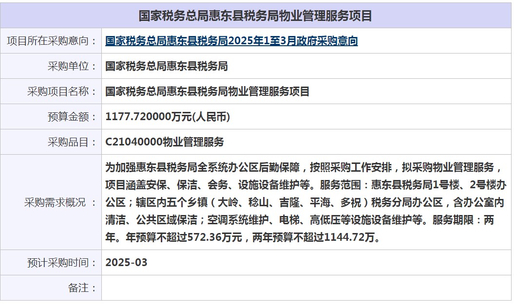国家税务总局惠东县税务局2025年1至3月政府采购意向-国家税务总局惠东县税务局物业管理服务项目