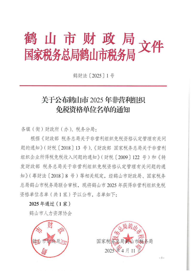 关于2025年获得鹤山市非营利组织免税资格单位名单的公告