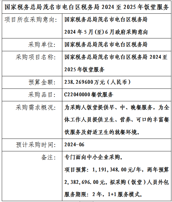 国家税务总局茂名市电白区税务局2024年5月至6月政府采购意向-国家税务总局茂名市电白区税务局2024至2025年饭堂服务 详细情况