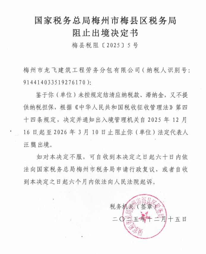 国家税务总局梅州市梅县区税务局阻止出境决定书