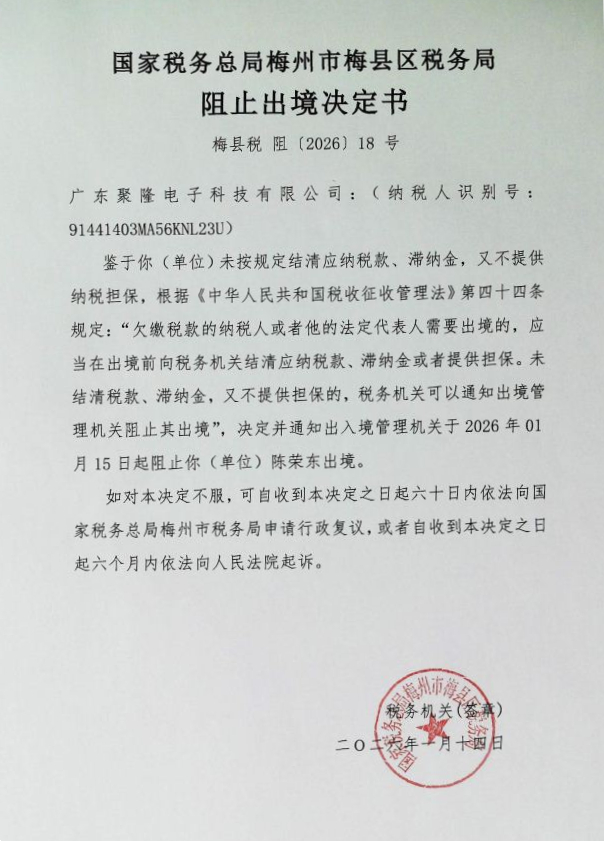 国家税务总局梅州市梅县区税务局阻止出境决定书
