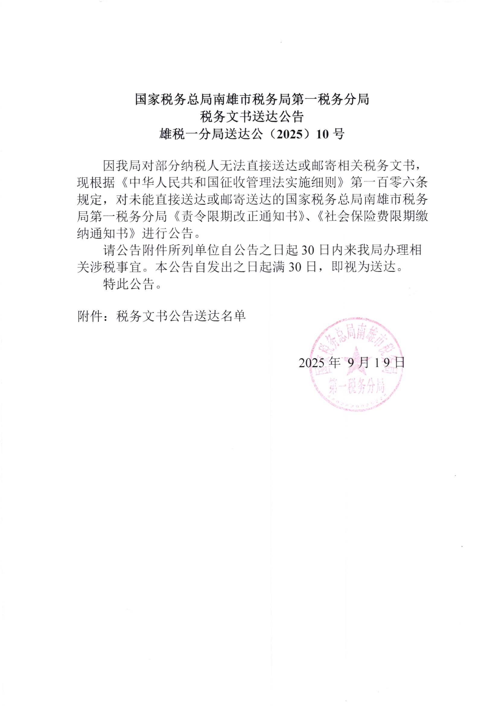 国家税务总局南雄市税务局第一税务分局税务文书送达公告