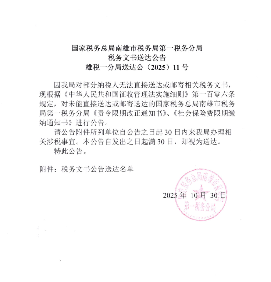 国家税务总局南雄市税务局第一税务分局税务文书送达公告