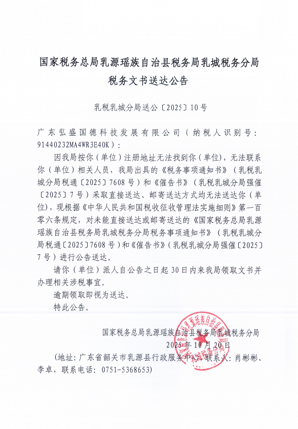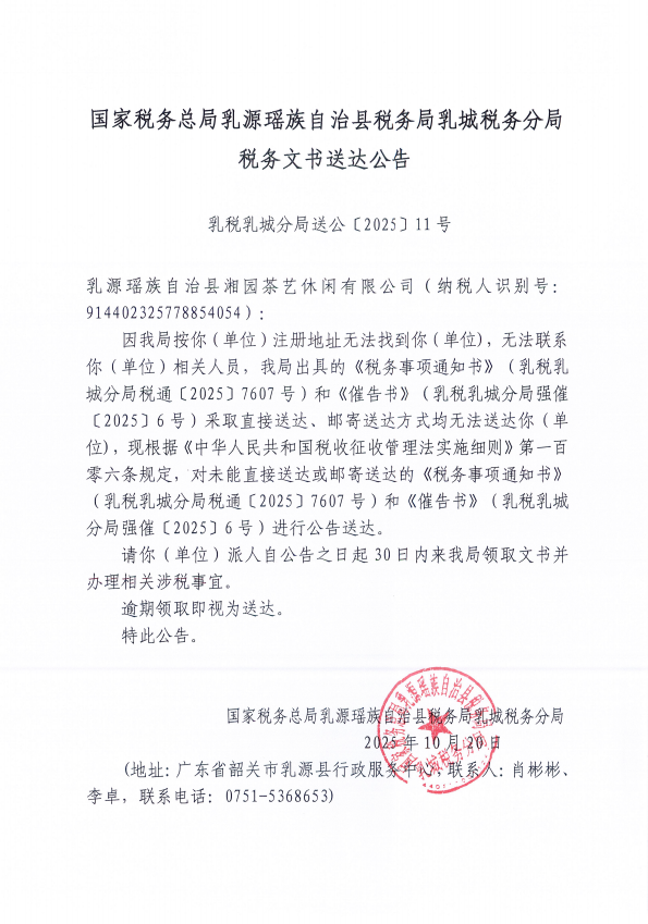 国家税务总局乳源瑶族自治县税务局乳城税务分局税务文书送达公告(十月)(二)