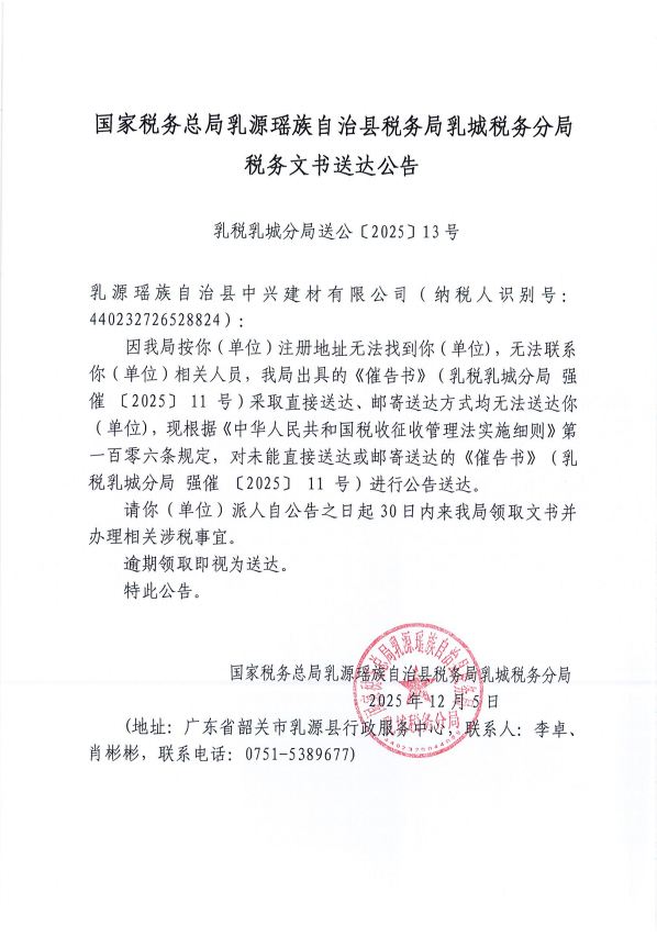 国家税务总局乳源瑶族自治县税务局乳城税务分局税务文书送达公告(十二月)