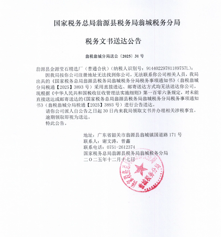 国家税务总局翁源县税务局翁城税务分局税务文书送达公告