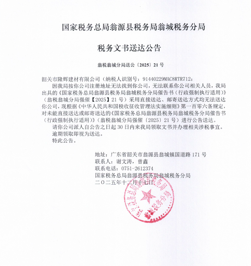 国家税务总局翁源县税务局翁城税务分局税务文书送达公告
