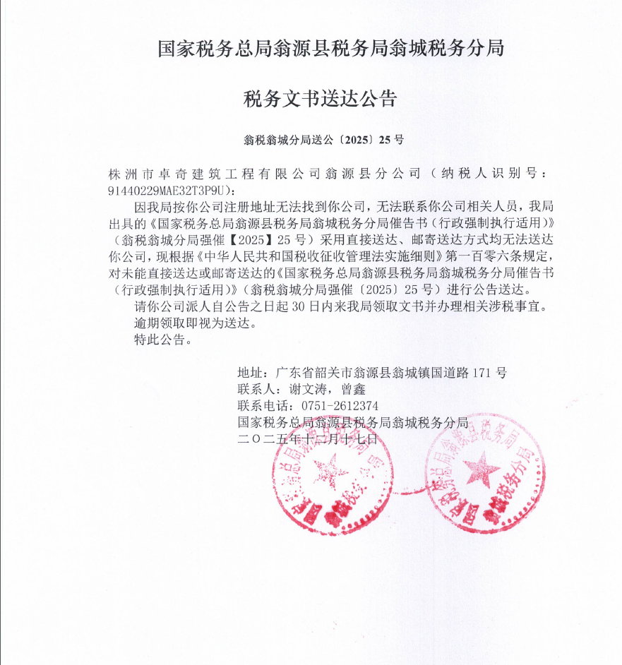 国家税务总局翁源县税务局翁城税务分局税务文书送达公告