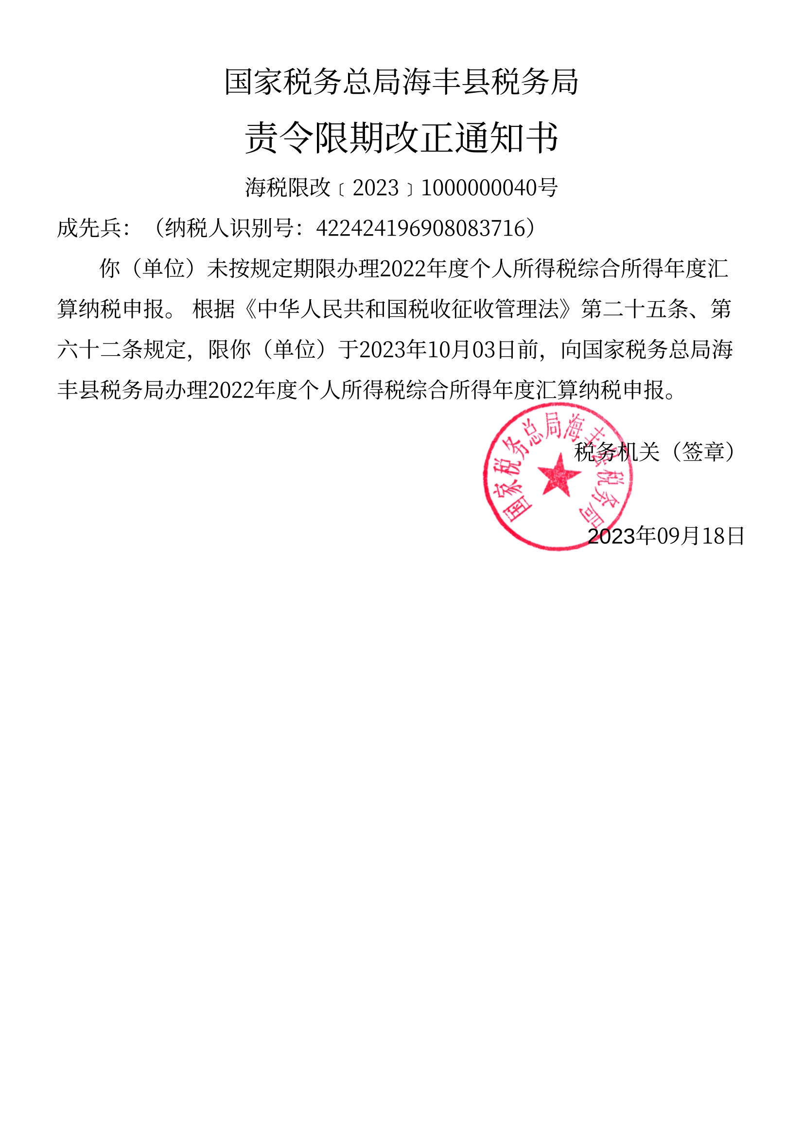 附件:《责令限期改正通知书》(海税限改[2023]1000000040号)