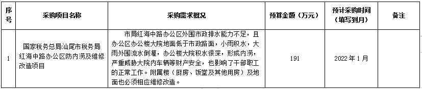 为便于供应商及时了解采购信息,根据《财政部关于开展政府采购意向公开工作的通知》(财库〔2020〕10号)等有关规定,现将国家税务总局汕尾市税务局2022年1至2月采购意向公开如下: