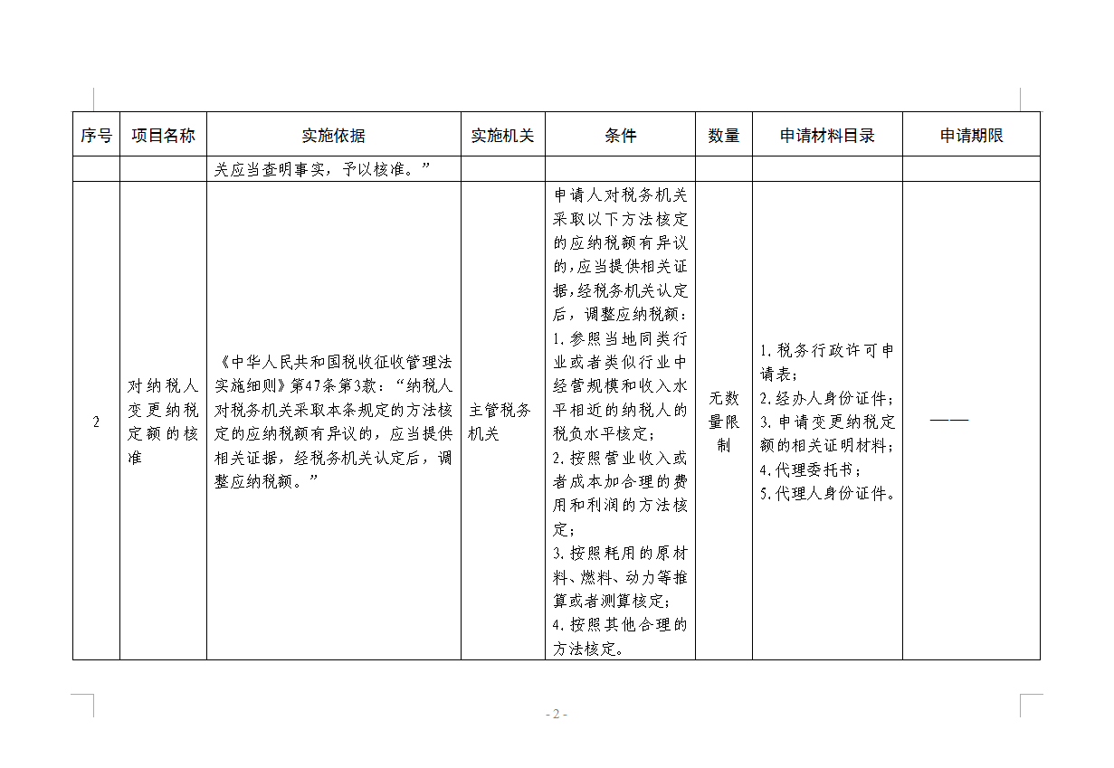 税务行政许可项目分项表