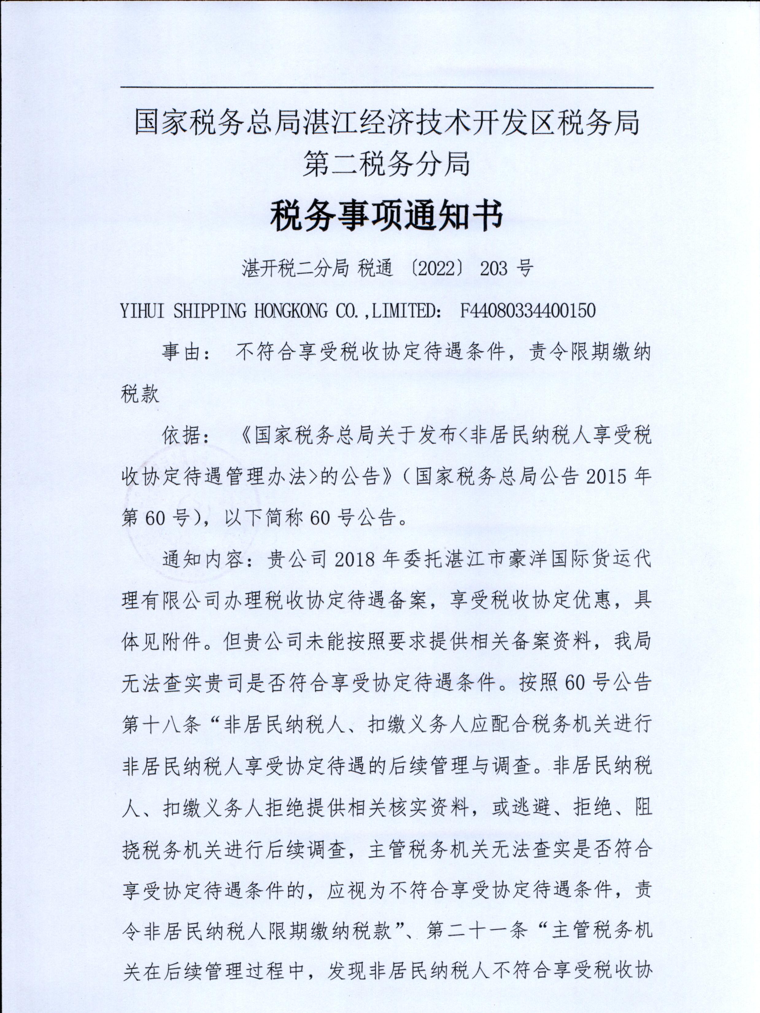 YIHUI SHIPPING HONGKONG CO.,LIMITED(纳税识别号:F44080334400150):