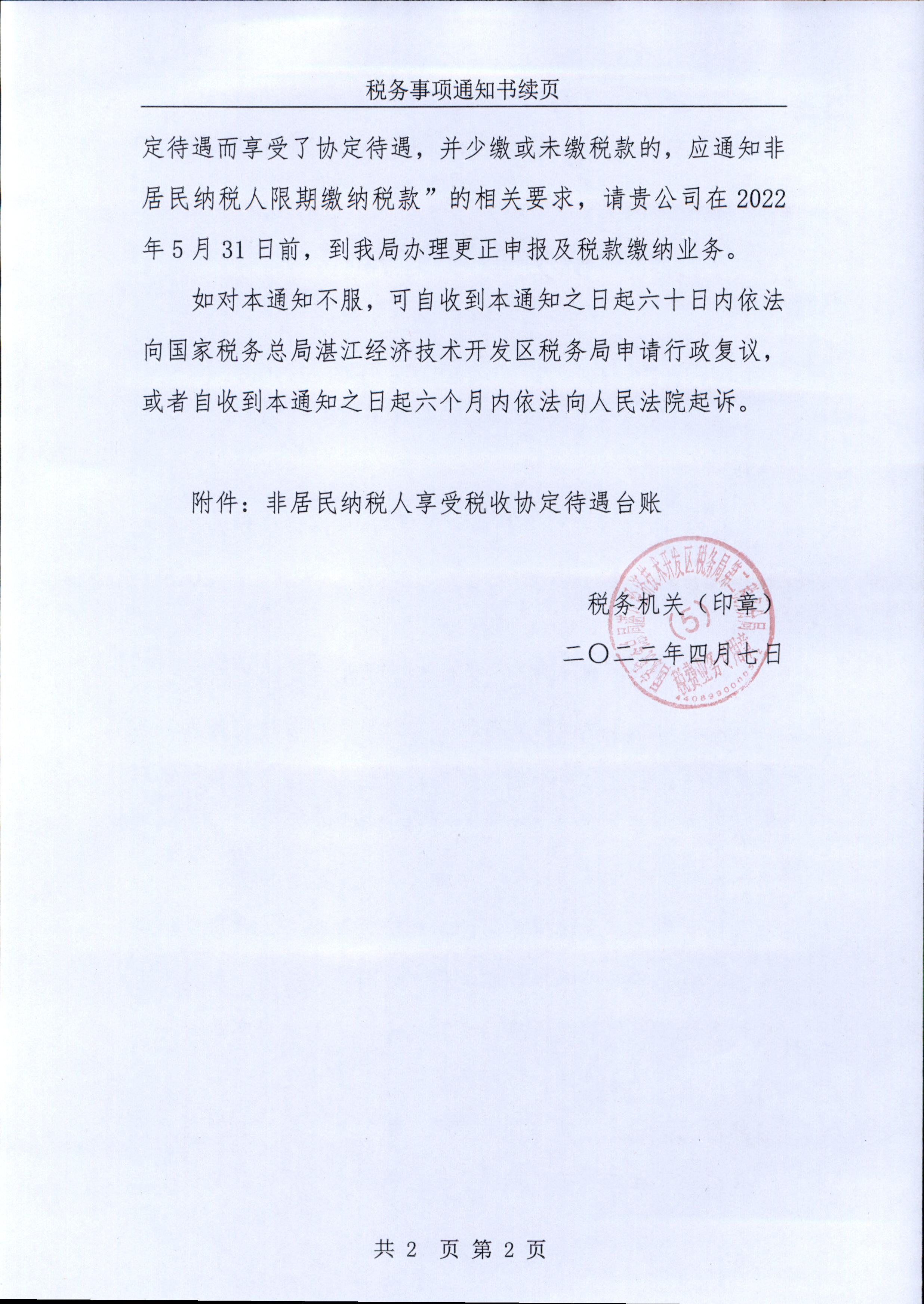 请你单位及时到我局(地址:湛江经济技术开发区乐山路35号银隆广场裙楼四楼)领取《税务事项通知书》(湛开税二分局 税通〔2022〕203号)正本,否则,自公告之日起满30日,上述《税务事项通知书》(湛开税二分局 税通〔2022〕203号)正本即视为送达。