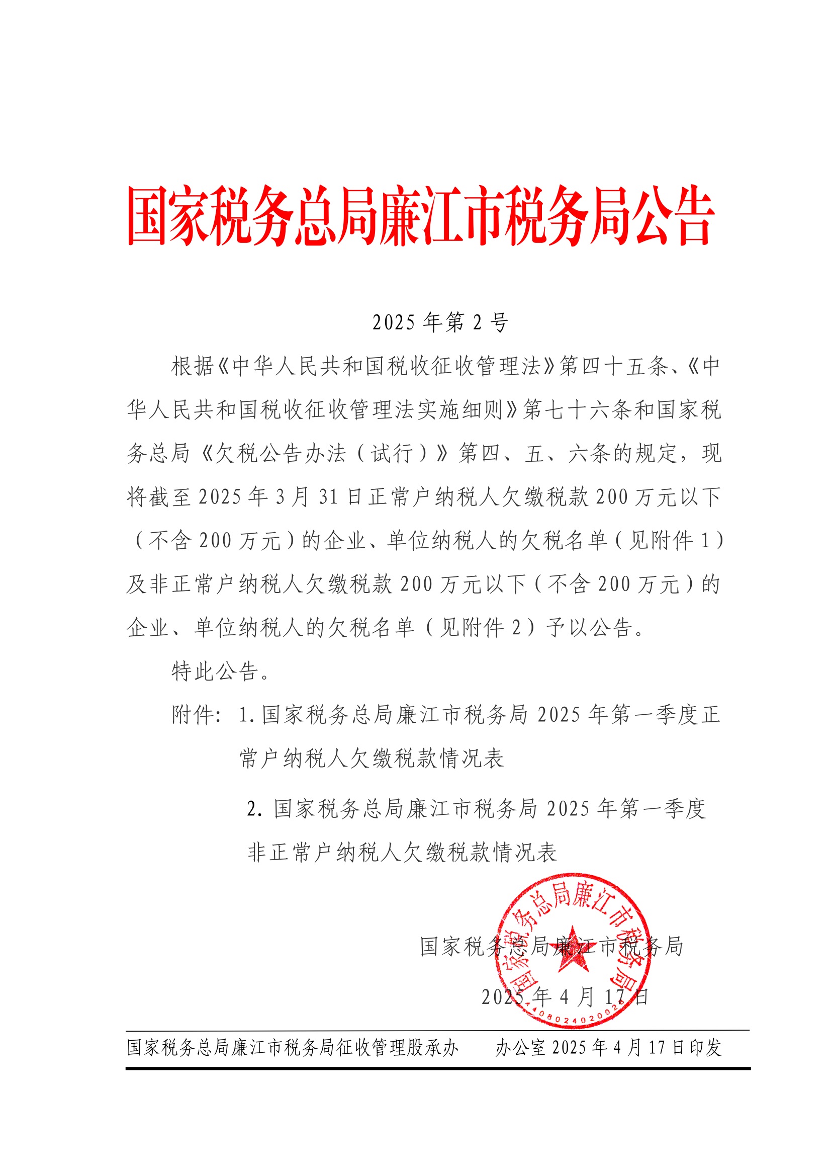 国家税务总局廉江市税务局关于2025年第一季度纳税人欠缴税款情况的公告