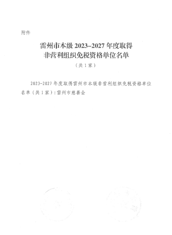 雷州市财政局 国家税务总局雷州市税务局关于雷州市本级2023——2027年度取得非营利组织免税资格单位名单的公告