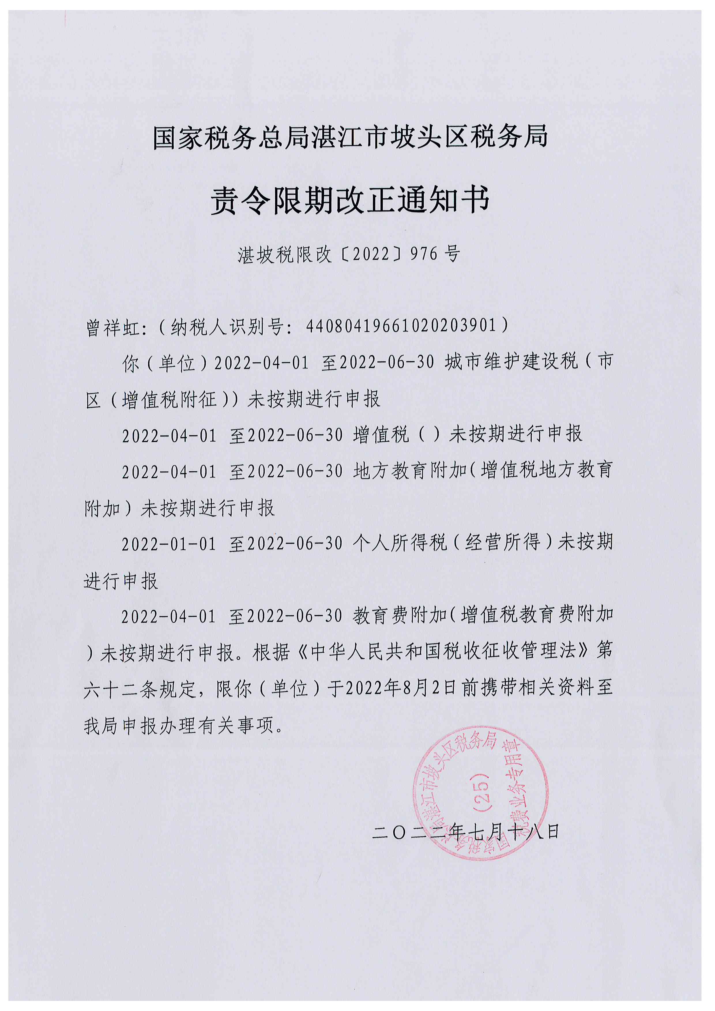 国家税务总局湛江市坡头区税务局责令限期改正通知书(湛坡税限改【2022】976号)