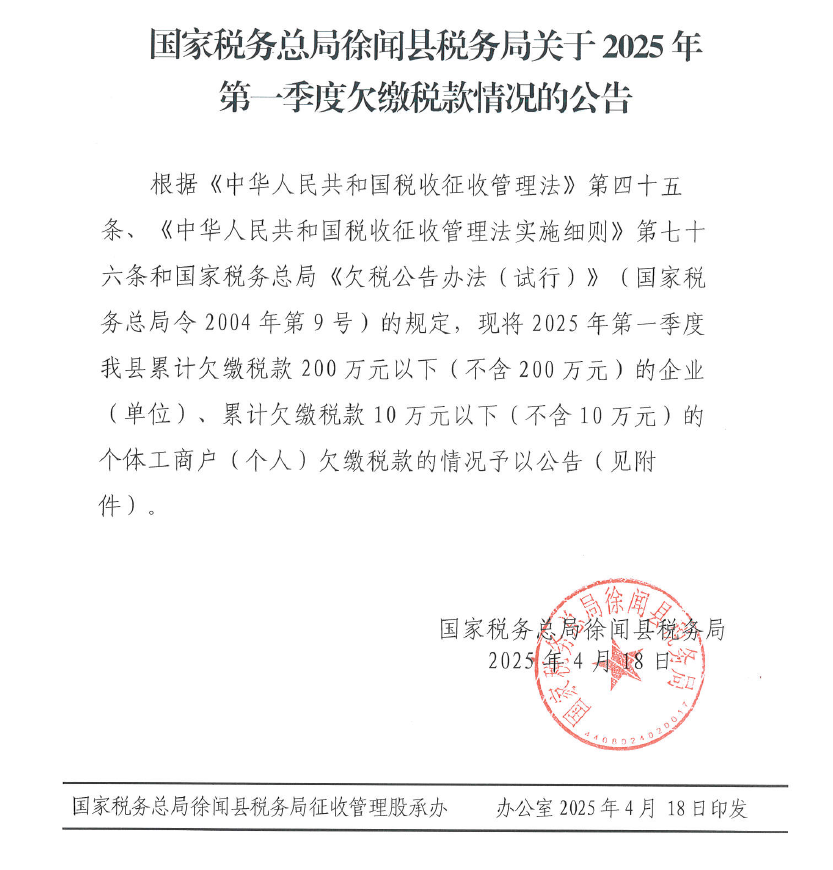 国家税务总局徐闻县税务局关于2025年第一季度欠缴税款情况的公告