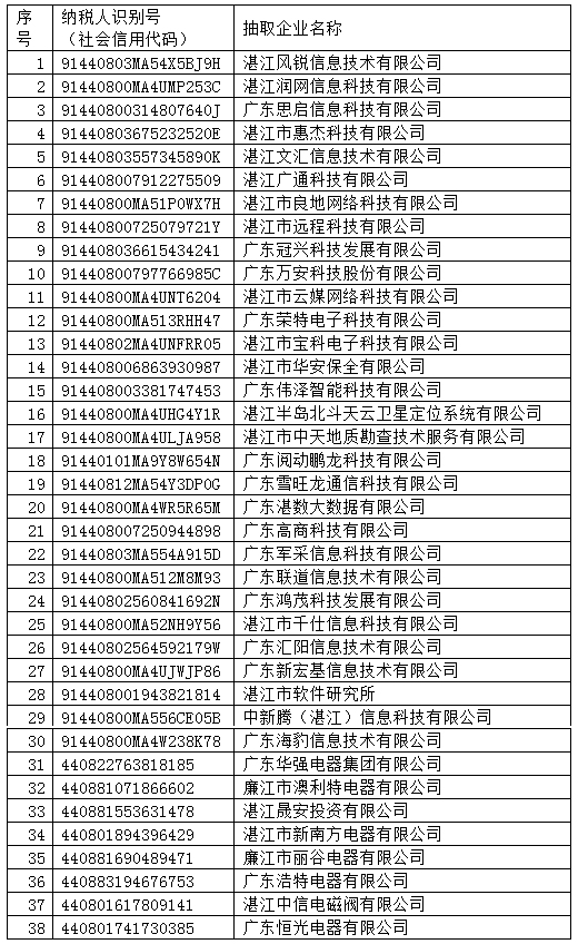 国家税务总局湛江市税务局稽查局通过金税三期税务稽查双随机工作平台,采用定向和不定向相结合的方式抽查的方式随机抽取38户企业。